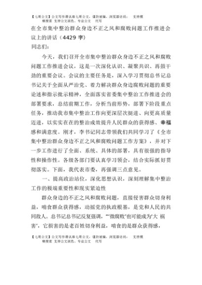 【七哥公文】2025年:在全市集中整治群众身边不正之风和腐败问题工作推进会议上的讲话(4429字)+更多免费公文+VX:QiGeGongWen2024