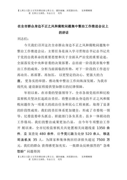 【七哥公文】2025年:在全市群众身边不正之风和腐败问题集中整治工作推进会议上的讲话+更多免费公文+VX:QiGeGongWen2024