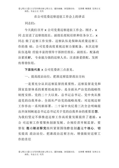 / 【七哥公文】2025年:在公司党委巡察进驻工作会上的讲话+更多免费公文+VX:QiGeGongWen2024