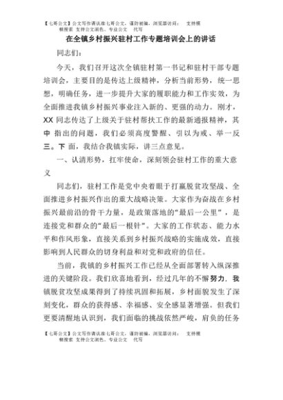 / 【七哥公文】2025年:在全镇乡村振兴驻村工作专题培训会上的讲话+更多免费公文+VX:QiGeGongWen2024
