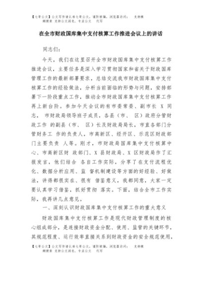 / 【七哥公文】2025年:在全市财政国库集中支付核算工作推进会议上的讲话+更多免费公文+VX:QiGeGongWen2024
