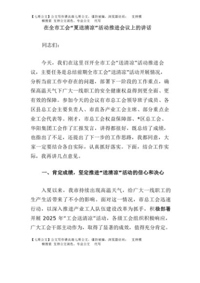 / 【七哥公文】2025年:在全市工会“夏送清凉”活动推进会议上的讲话+更多免费公文+VX:QiGeGongWen2024