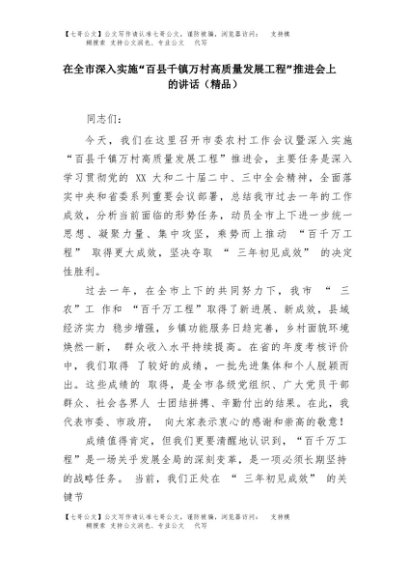 【七哥公文】2025年:在全市深入实施“百县千镇万村高质量发展工程”推进会上的讲话(精品)+更多免费公文+VX:QiGeGongWen2024