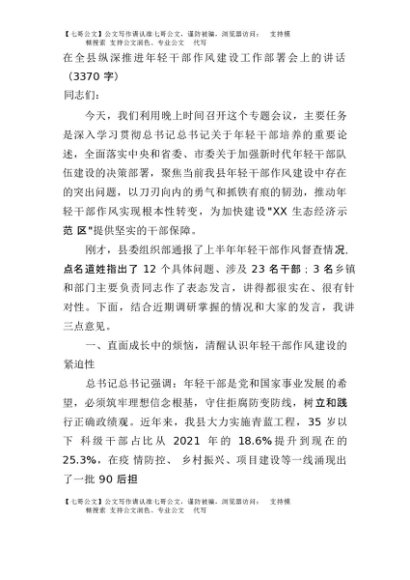 【七哥公文】2025年:在全县纵深推进年轻干部作风建设工作部署会上的讲话(3370字)+更多免费公文+VX:QiGeGongWen2024