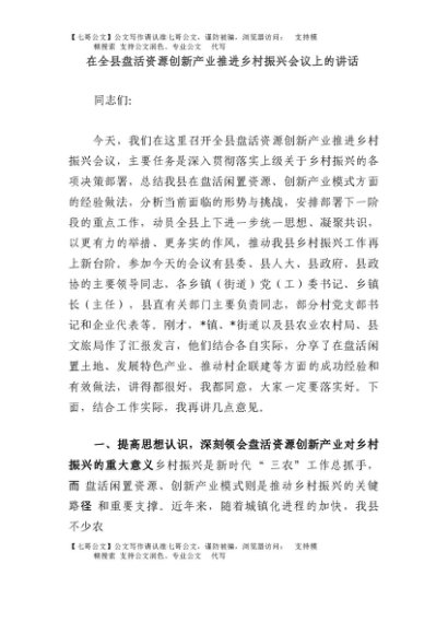 / 【七哥公文】2025年:在全县盘活资源创新产业推进乡村振兴会议上的讲话+更多免费公文+VX:QiGeGongWen2024