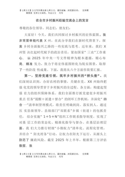 / 【七哥公文】2025年:在全市乡村振兴经验交流会上的发言+更多免费公文+VX:QiGeGongWen2024