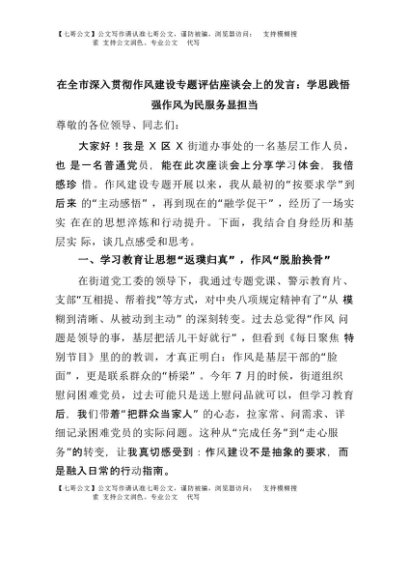 【七哥公文】2025年:在全市深入贯彻作风建设专题评估座谈会上的发言:学思践悟强作风为民服务显担当+更多免费公文+VX:QiGeGongWen2024