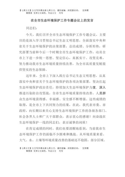 / 【七哥公文】2025年:在全市生态环境保护工作专题会议上的发言+更多免费公文+VX:QiGeGongWen2024