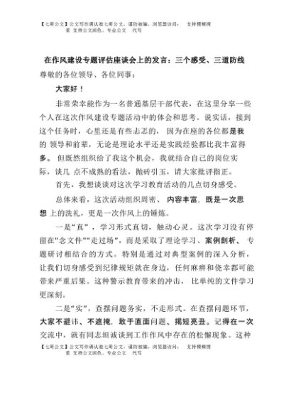 【七哥公文】2025年:在作风建设专题评估座谈会上的发言:三个感受、三道防线+更多免费公文+VX:QiGeGongWen2024