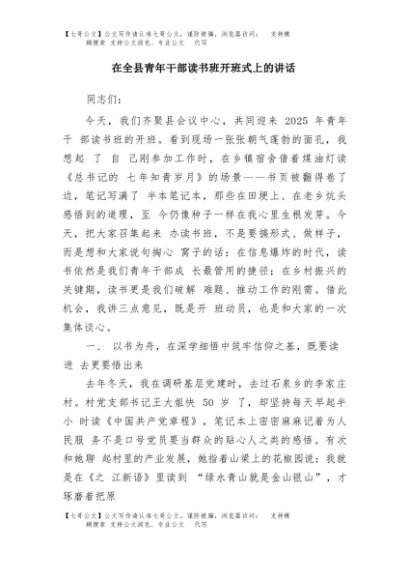 / 【七哥公文】2025年:在全县青年干部读书班开班式上的讲话+更多免费公文+VX:QiGeGongWen2024