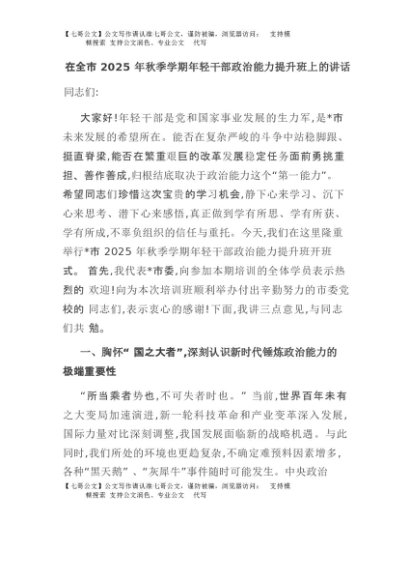 【七哥公文】2025年:在全市2025年秋季学期年轻干部政治能力提升班上的讲话+更多免费公文+VX:QiGeGongWen2024