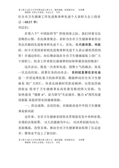 【七哥公文】2025年:在全市卫生健康工作先进集体和先进个人表彰大会上的讲话(4837字)+更多免费公文+VX:QiGeGongWen2024
