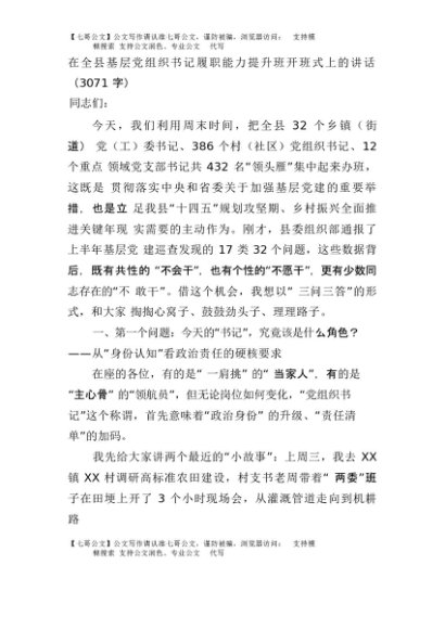 【七哥公文】2025年:在全县基层党组织书记履职能力提升班开班式上的讲话(3071字)+更多免费公文+VX:QiGeGongWen2024