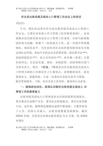 / 【七哥公文】2025年:在全县出租房屋及流动人口管理工作会议上的讲话+更多免费公文+VX:QiGeGongWen2024