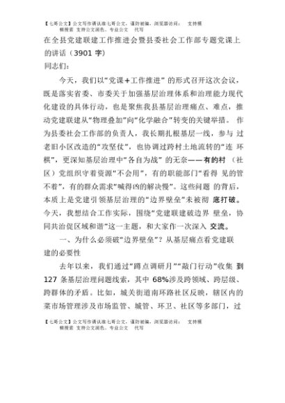 【七哥公文】2025年:在全县党建联建工作推进会暨县委社会工作部专题党课上的讲话(3901字)+更多免费公文+VX:QiGeGongWen2024