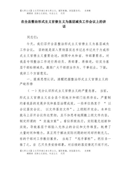 【七哥公文】2025年:在全县整治形式主义官僚主义为基层减负工作会议上的讲话+更多免费公文+VX:QiGeGongWen2024