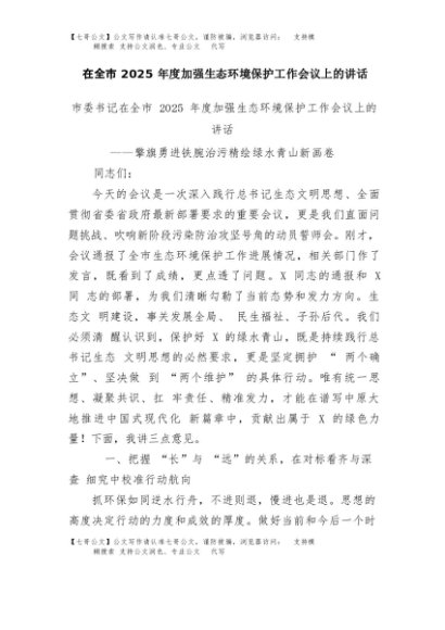 【七哥公文】2025年:在全市2025年度加强生态环境保护工作会议上的讲话+更多免费公文+VX:QiGeGongWen2024