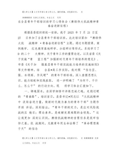 【七哥公文】2025年:在全县青年干部培训班学习心得体会(赓续伟大抗战精神青春奋进新征程)+更多免费公文+VX:QiGeGongWen2024
