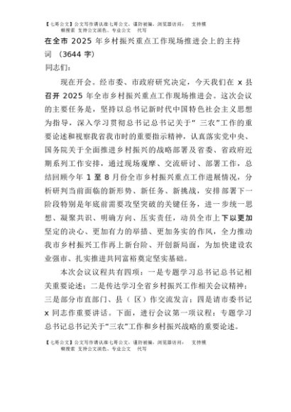 【七哥公文】2025年:在全市2025年乡村振兴重点工作现场推进会上的主持词(3644字)+更多免费公文+VX:QiGeGongWen2024