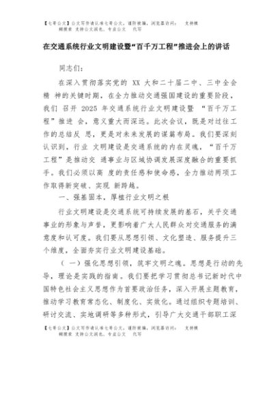 【七哥公文】2025年:在交通系统行业文明建设暨“百千万工程”推进会上的讲话+更多免费公文+VX:QiGeGongWen2024