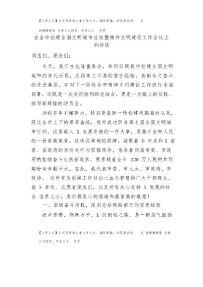 【七哥公文】2025年:在全市创建全国文明城市总结暨精神文明建设工作会议上的讲话+更多免费公文+VX:QiGeGongWen2024