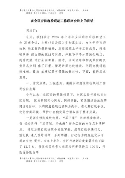 / 【七哥公文】2025年:在全区府院府检联动工作联席会议上的讲话+更多免费公文+VX:QiGeGongWen2024