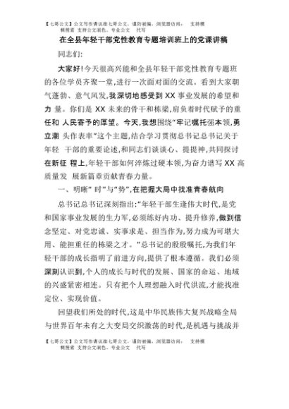 / 【七哥公文】2025年:在全县年轻干部党性教育专题培训班上的党课讲稿+更多免费公文+VX:QiGeGongWen2024