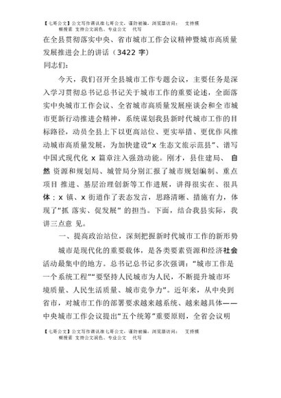 【七哥公文】2025年:在全县贯彻落实中央、省市城市工作会议精神暨城市高质量发展推进会上的讲话(3422字)+更多免费公文+VX:QiGeGongWen2024