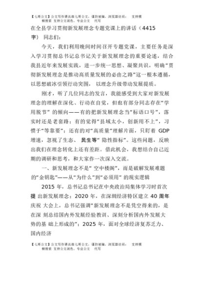 【七哥公文】2025年:在全县学习贯彻新发展理念专题党课上的讲话(4415字)+更多免费公文+VX:QiGeGongWen2024