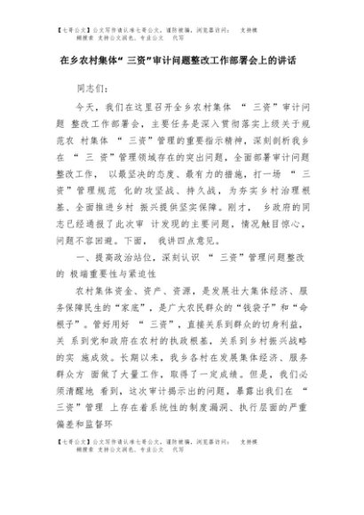 【七哥公文】2025年:在乡农村集体“三资”审计问题整改工作部署会上的讲话+更多免费公文+VX:QiGeGongWen2024