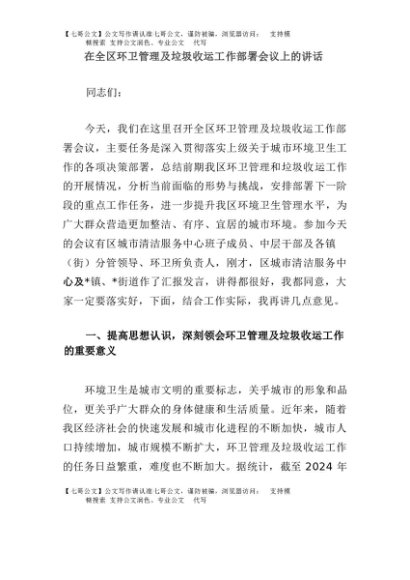 / 【七哥公文】2025年:在全区环卫管理及垃圾收运工作部署会议上的讲话+更多免费公文+VX:QiGeGongWen2024