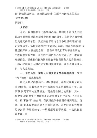 【七哥公文】2025年:在“铭记抗战历史,弘扬抗战精神”主题学习活动上的发言(2139字)+更多免费公文+VX:QiGeGongWen2024
