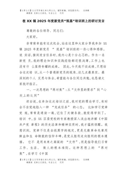 【七哥公文】2025年:在XX镇2025年度新党员“筑基”培训班上的研讨发言+更多免费公文+VX:QiGeGongWen2024