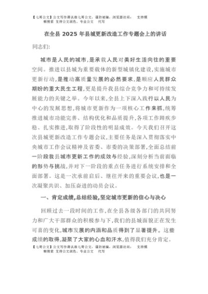 / 【七哥公文】2025年:在全县2025年县城更新改造工作专题会上的讲话+更多免费公文+VX:QiGeGongWen2024