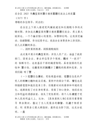 【七哥公文】2025年:在全区2025年典型案例警示教育思想交流会上的发言(3175字)+更多免费公文+VX:QiGeGongWen2024