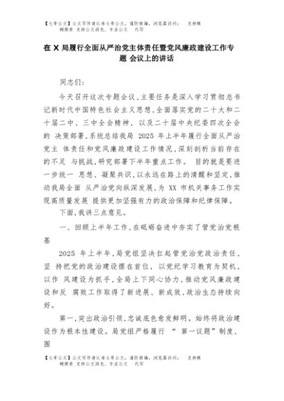 【七哥公文】2025年:在X局履行全面从严治党主体责任暨党风廉政建设工作专题会议上的讲话+更多免费公文+VX:QiGeGongWen2024