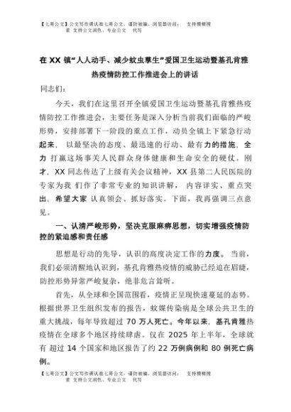 【七哥公文】2025年:在XX镇“人人动手、减少蚊虫孳生”爱国卫生运动暨基孔肯雅热疫情防控工作推进会上的讲话+更多免费公文+VX:QiGeGongWen2024
