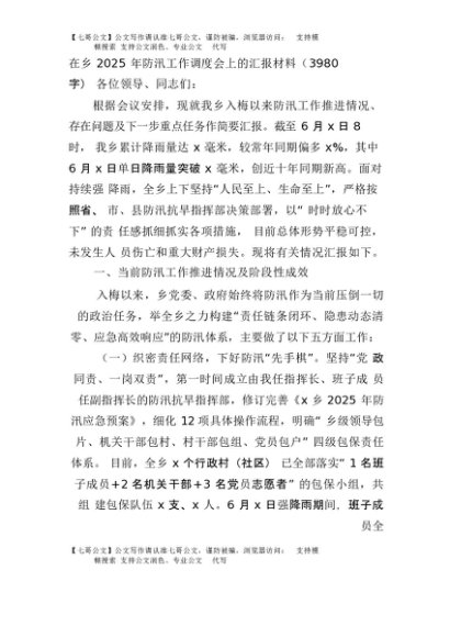 【七哥公文】2025年:在乡2025年防汛工作调度会上的汇报材料(3980字)+更多免费公文+VX:QiGeGongWen2024