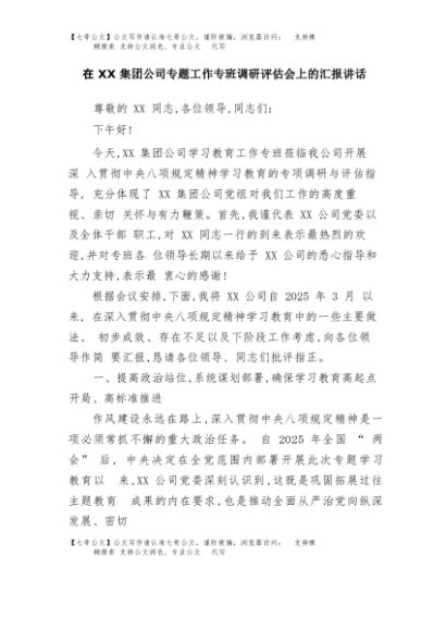 【七哥公文】2025年:在XX集团公司专题工作专班调研评估会上的汇报讲话+更多免费公文+VX:QiGeGongWen2024