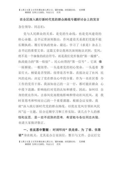 【七哥公文】2025年:在全区深入践行新时代党的群众路线专题研讨会上的发言+更多免费公文+VX:QiGeGongWen2024