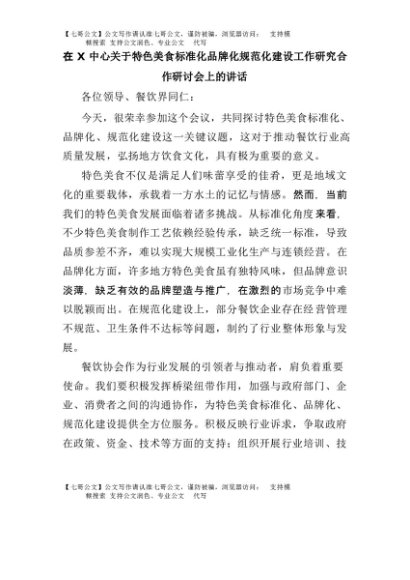 【七哥公文】2025年:在X中心关于特色美食标准化品牌化规范化建设工作研究合作研讨会上的讲话+更多免费公文+VX:QiGeGongWen2024