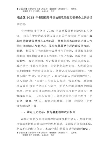 【七哥公文】2025年:在全区2025年暑期校外培训治理攻坚行动部署会上的讲话+更多免费公文+VX:QiGeGongWen2024