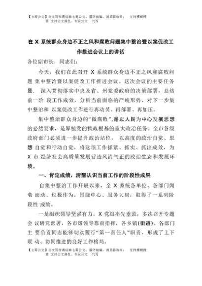 【七哥公文】2025年:在X系统群众身边不正之风和腐败问题集中整治暨以案促改工作推进会议上的讲话+更多免费公文+VX:QiGeGongWen2024