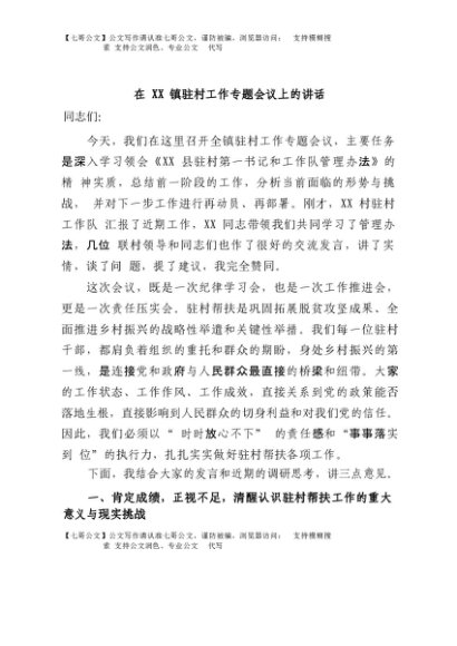 / 【七哥公文】2025年:在XX镇驻村工作专题会议上的讲话+更多免费公文+VX:QiGeGongWen2024
