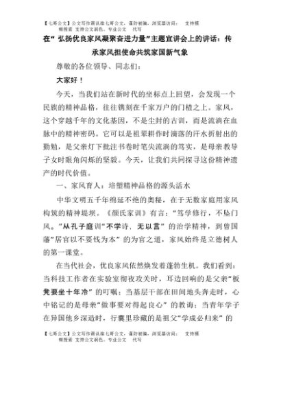 【七哥公文】2025年:在“弘扬优良家风凝聚奋进力量”主题宣讲会上的讲话:传承家风担使命共筑家国新气象+更多免费公文+VX:QiGeGongWen2024