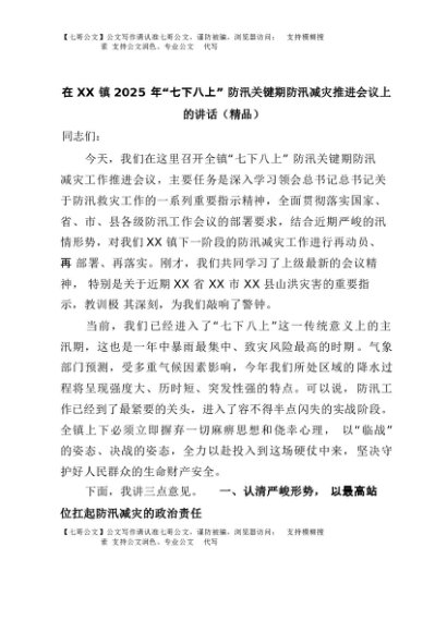【七哥公文】2025年:在XX镇2025年“七下八上”防汛关键期防汛减灾推进会议上的讲话(精品)+更多免费公文+VX:QiGeGongWen2024