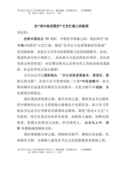 【七哥公文】2025年:在“迎中秋 庆国庆”文艺汇演上的致辞+更多免费公文+VX:QiGeGongWen2024