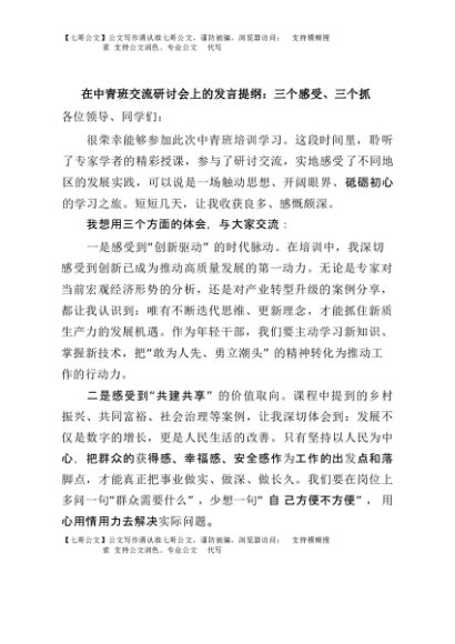 【七哥公文】2025年:在中青班交流研讨会上的发言提纲:三个感受、三个抓+更多免费公文+VX:QiGeGongWen2024