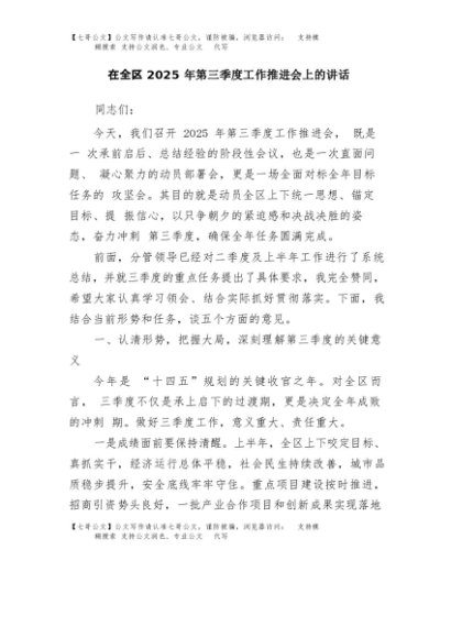 / 【七哥公文】2025年:在全区2025年第三季度工作推进会上的讲话+更多免费公文+VX:QiGeGongWen2024