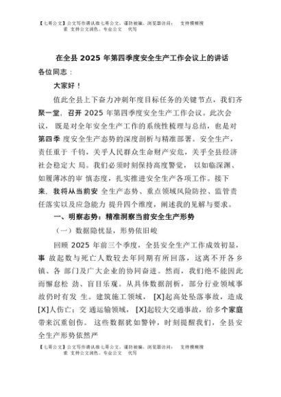 【七哥公文】2025年:在全县2025年第四季度安全生产工作会议上的讲话+更多免费公文+VX:QiGeGongWen2024
